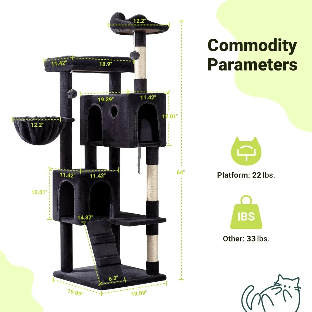 64-Inch Tall Cat Tower with Multi-Level Play Areas for Large Indoor Cats - Includes 2 Plush Beds, 2 Perches, Basket, and House w
