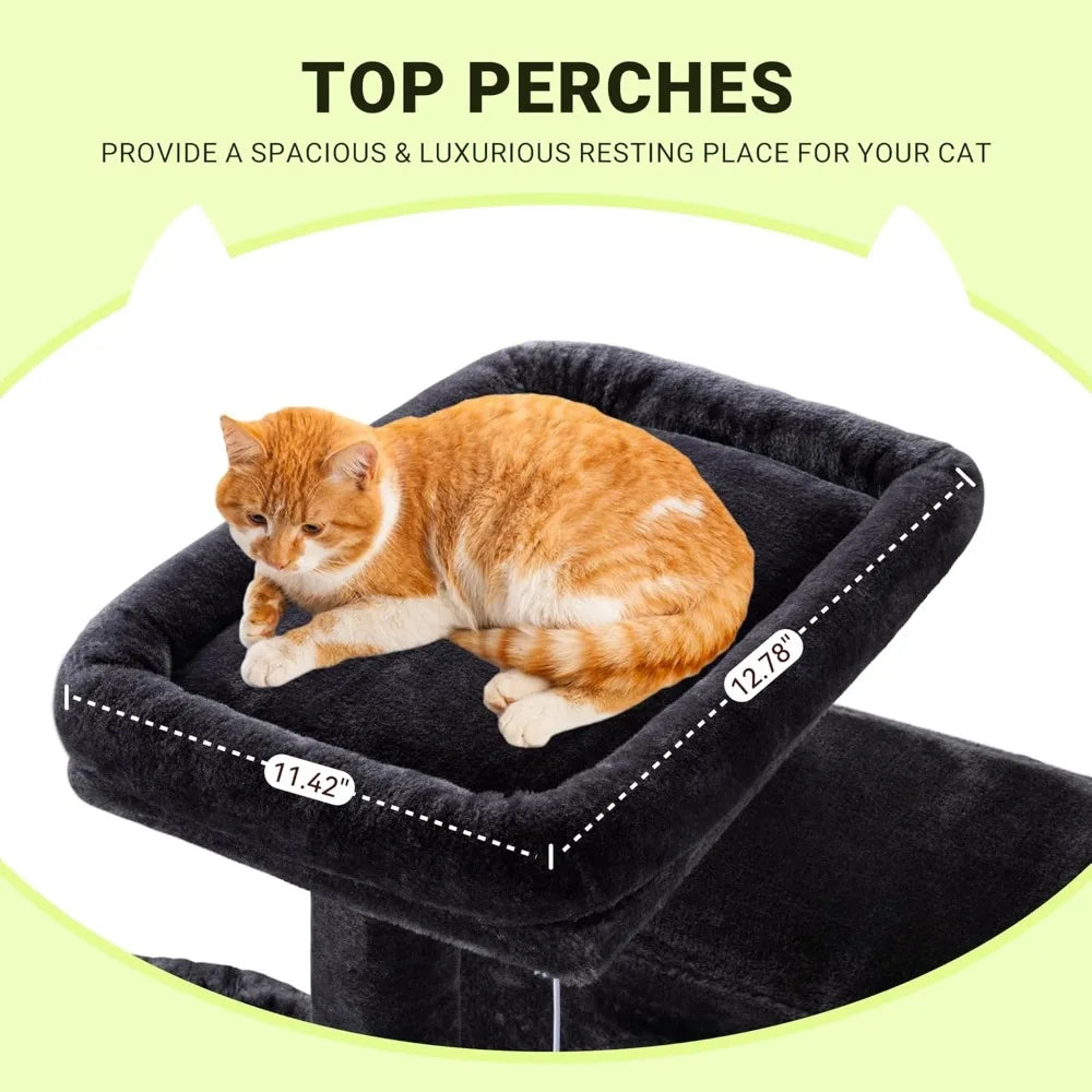 This cat tree is a multifunctional activity center designed to provide both play and relaxation for your cat. It features two top perch platforms and two cozy condos, allowing your cat to stretch out or curl up in comfort. The structure is made from CARB P2-compliant particle board, covered in ultra-soft plush, and includes sisal-covered posts that cater to your cat's scratching needs, helping to protect your furniture from scratches. The cat tree also includes a two-door cozy condo, which provides easy access and movement for your cat, along with enhanced ventilation and additional space for stretching and lounging. The base of the tree is reinforced with multiple layers of thick material, ensuring stability and strength, and it can support up to 33 lbs. Anti-tip fittings are included to prevent the tree from rocking or tipping over. Assembly is straightforward, with a detailed assembly guide and all necessary tools provided. Each part is clearly labeled, making the installation process smooth. You can set up this cat paradise in approximately 40 minutes, offering your cat a space to explore and enjoy.