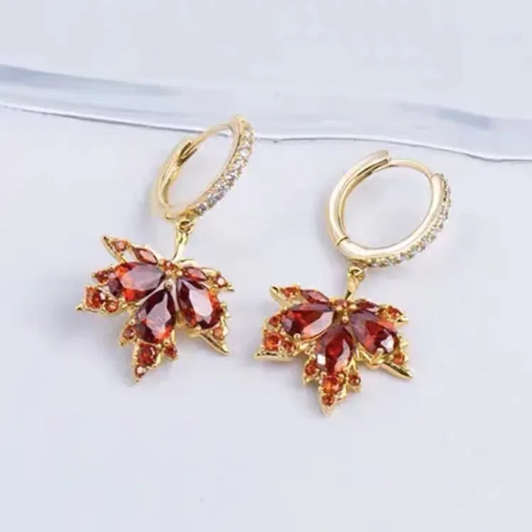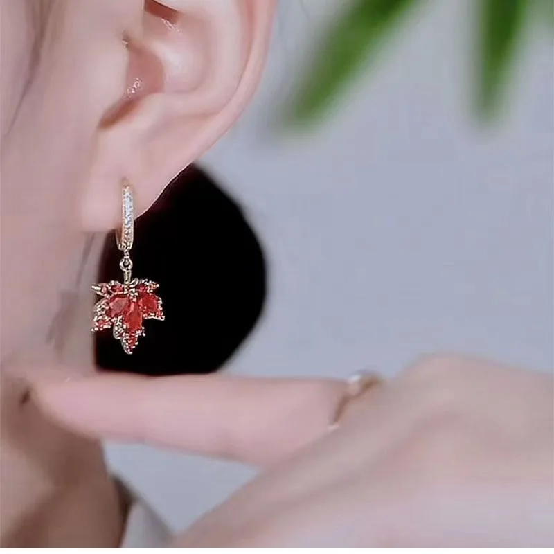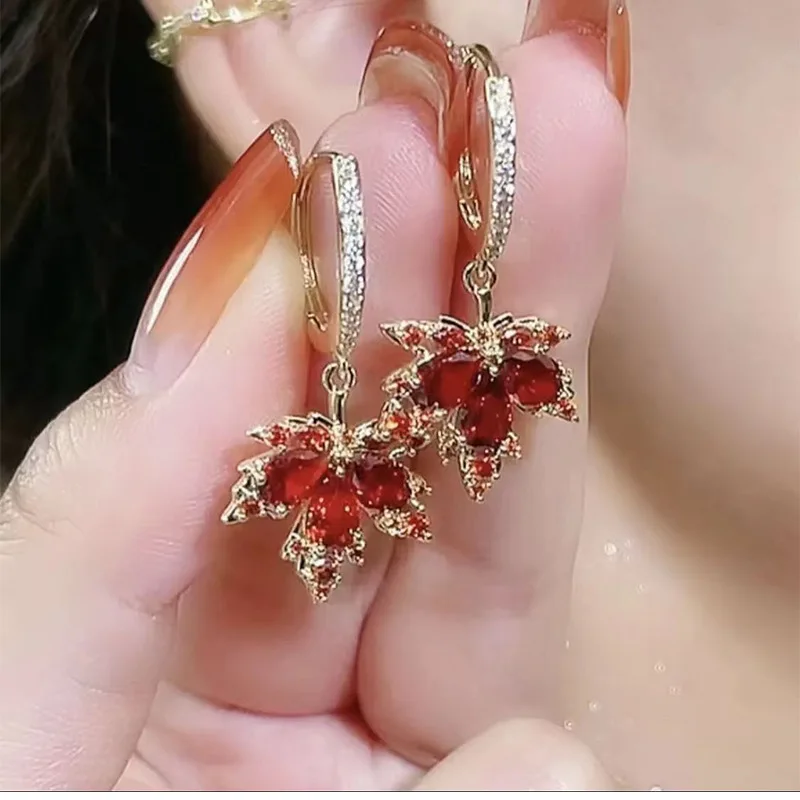 French Vintage Crystal Zircon Red Maple Leaf Earrings for Women Temperament Rhinestone Tassel Earrings Party Jewelry Bijoux Gift